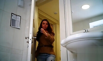 Cute milky teenie chick in black nylon pantyhose pisses in the toilet
