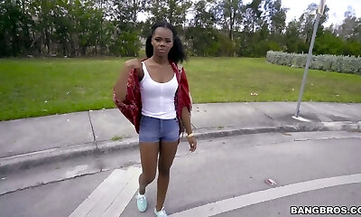 Fabulous and filthy black chick shows her breasts and deep-throats big dick in the bangbus